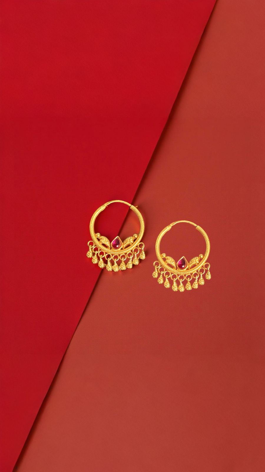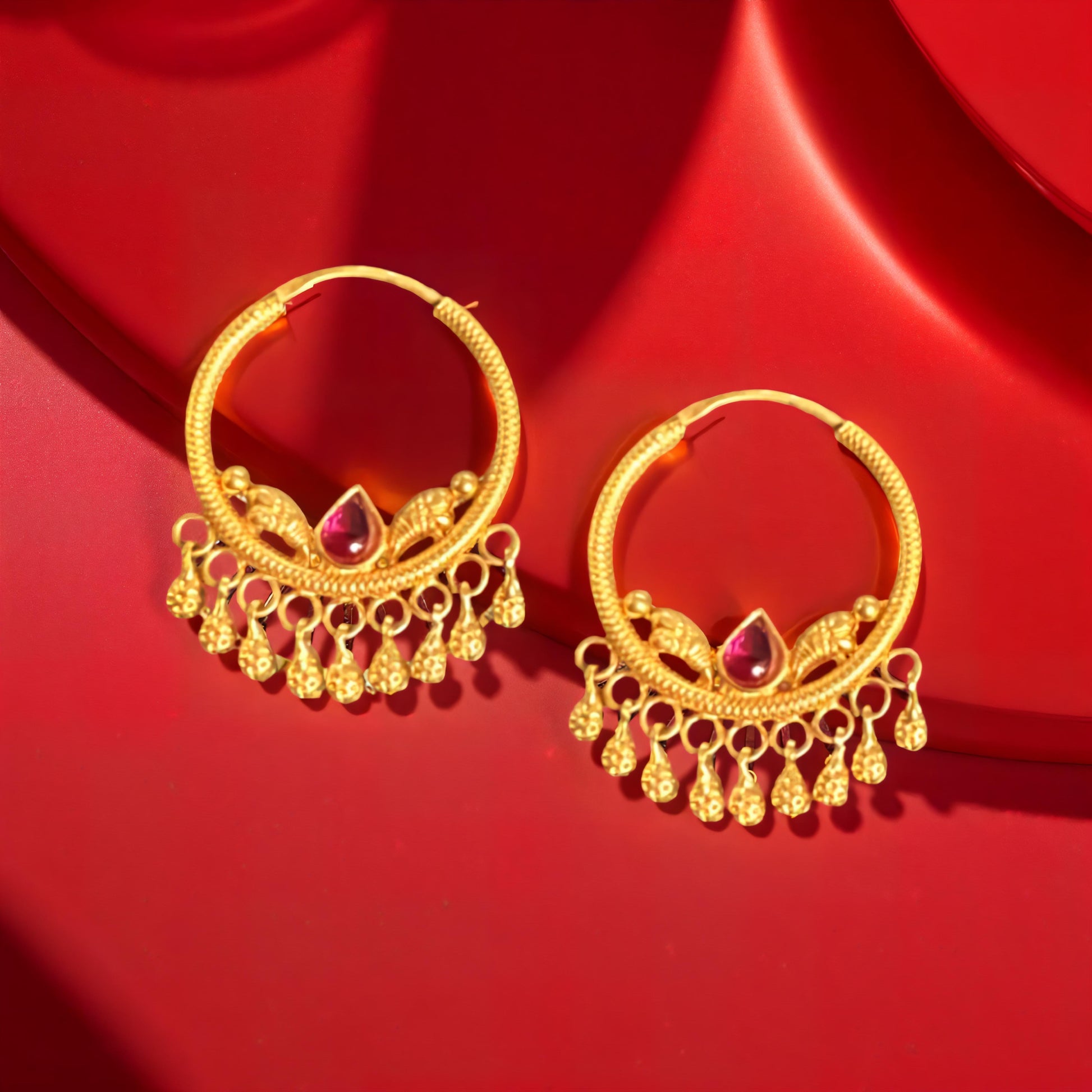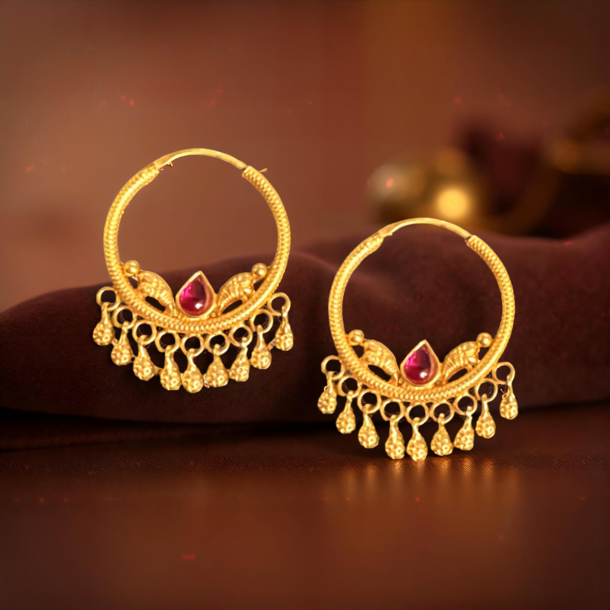 Meticulously crafted Temple Antique Gold Ringa earrings featuring an exquisite leafy feather design adorned with diamond accents. These statement pieces blend traditional temple artistry with contemporary elegance, offering a perfect balance of cultural heritage and modern sophistication. Ideal for special occasions or as an heirloom addition to your fine jewelry collection.